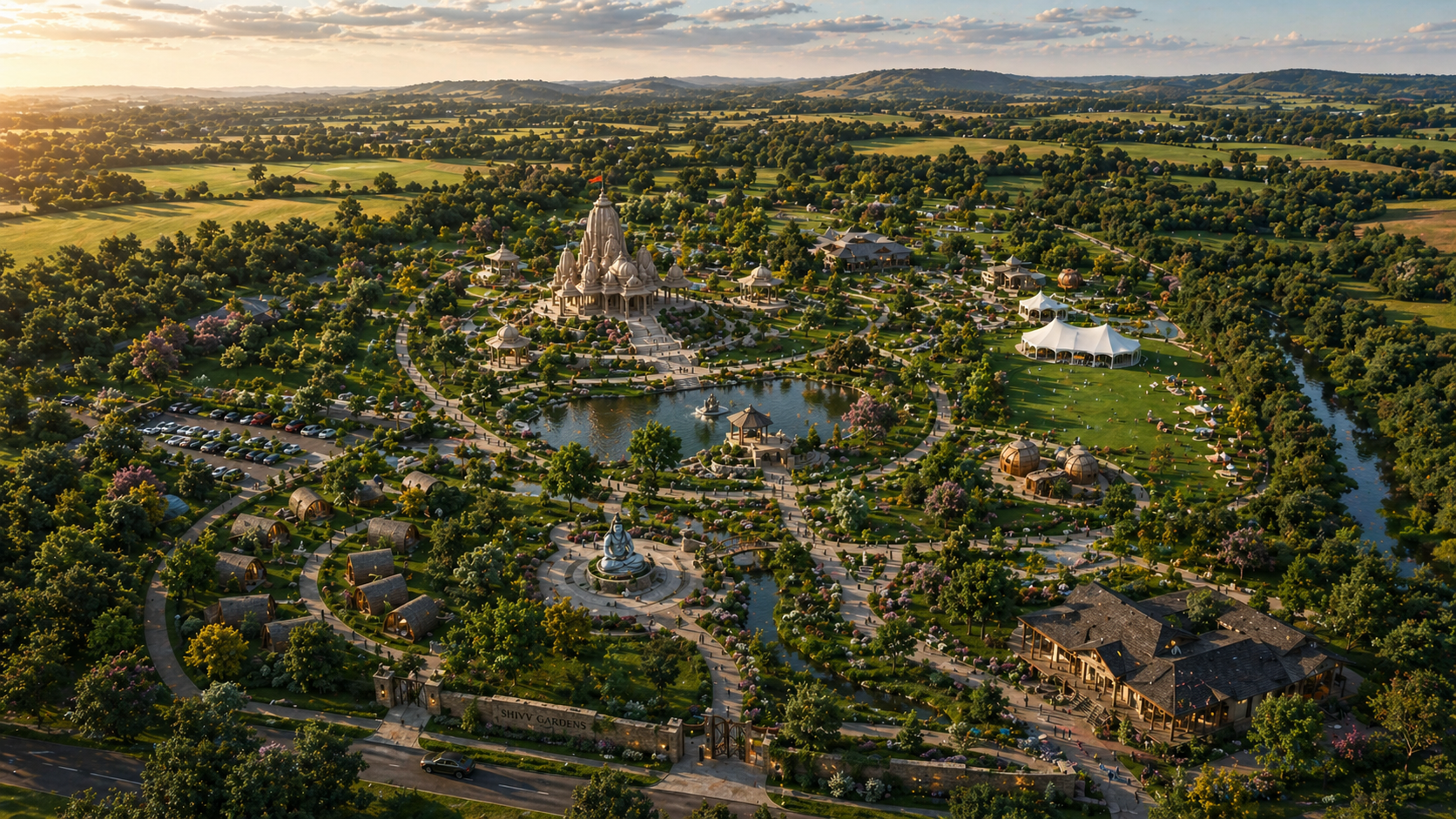 Shiv Gardens is an early-stage concept for a large-scale cultural and spiritual destination in the United Kingdom. The vision brings together landscape, heritage and community in a carefully designed environment intended for reflection, learning and connection.